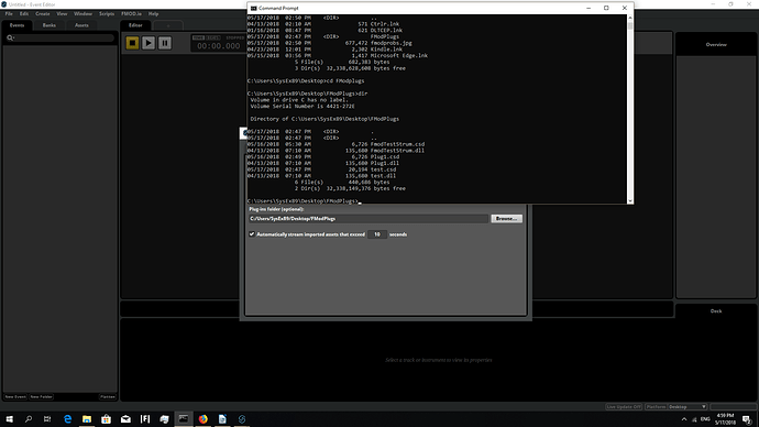 Does the FMOD Console window print anything of note? I also just did a fresh install of FMOD. And it works fine where. Hmm. Any other ideas? Can you try putting the fmod plugin folder somewhere else? Perhaps there are permission issues with your desktop folder. Try somewhere in “My Documents” perhaps.